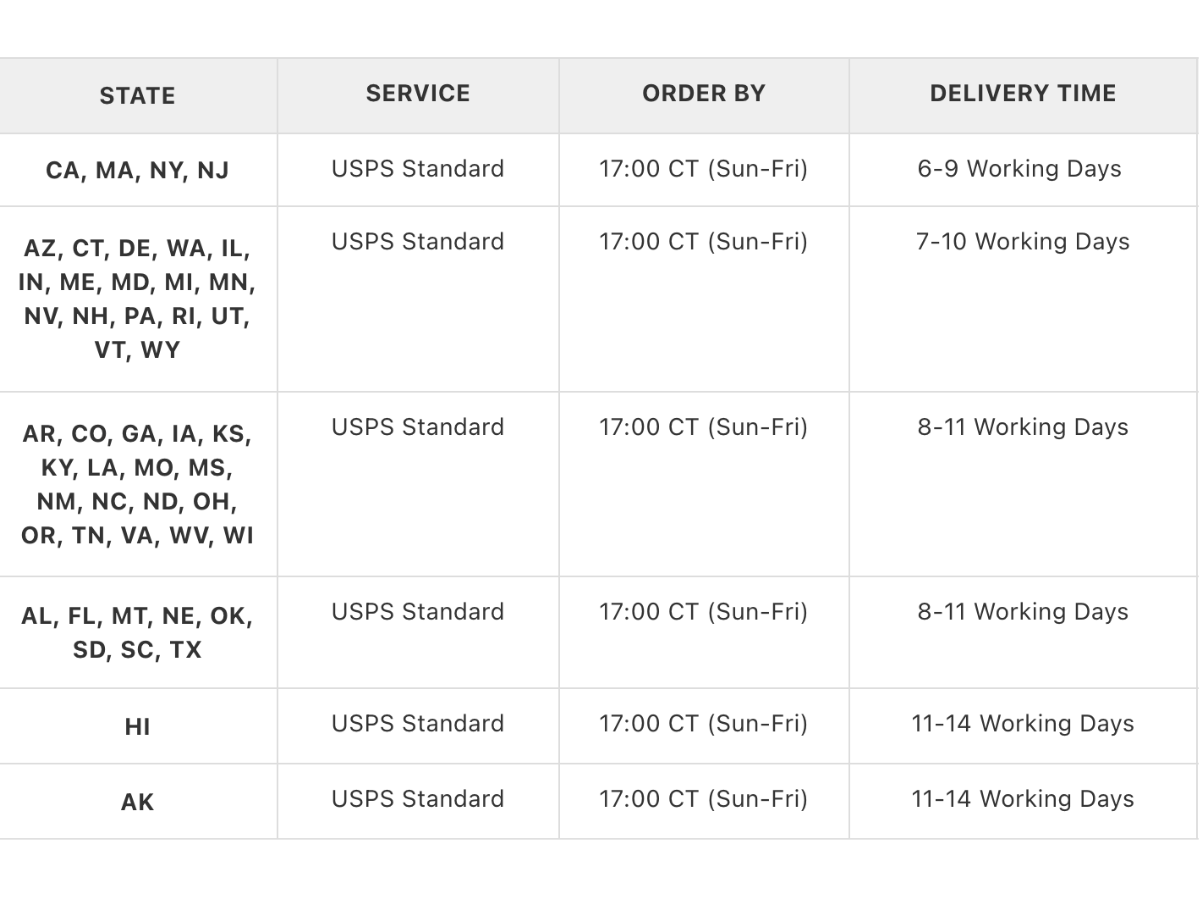 Timeframes for standard delivery options are in business days (Mon-Fri).