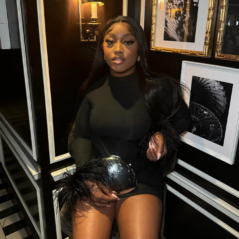 Bring full drama to the dance floor with the Feather Flirt Mini Dress — a sleek, body-hugging stunner featuring soft feather patchwork at the hem for a bold, playful finish. This dress is built from a smooth poly-spandex blend that moves with you while keeping your shape snatched all night long.