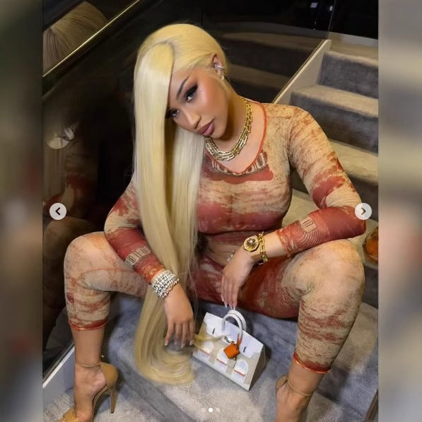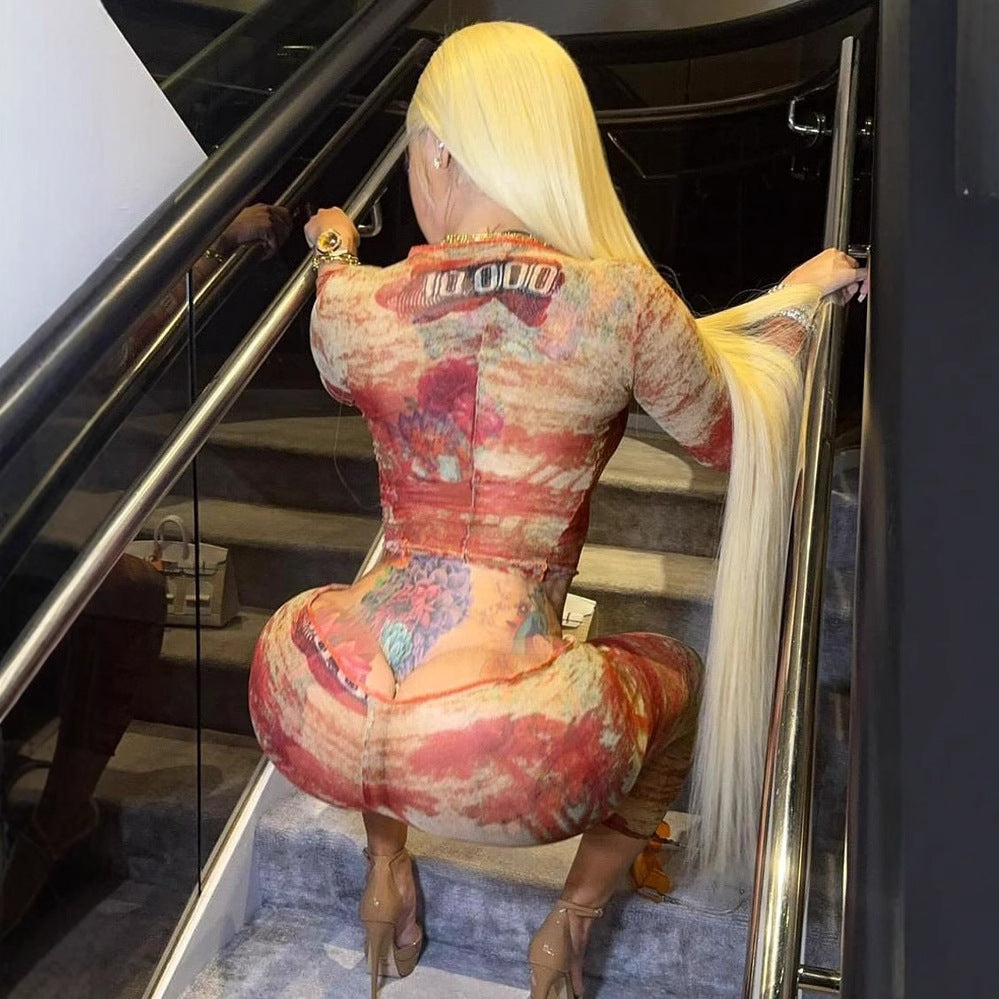 Our Spring Mesh Printed Two-Piece Set features a breathable, see-through design with vibrant prints that pop on melanin and glow under sunlight. The round neck, long sleeve top + matching fitted pants combo gives you body-hugging confidence, all while staying breezy and lightweight.